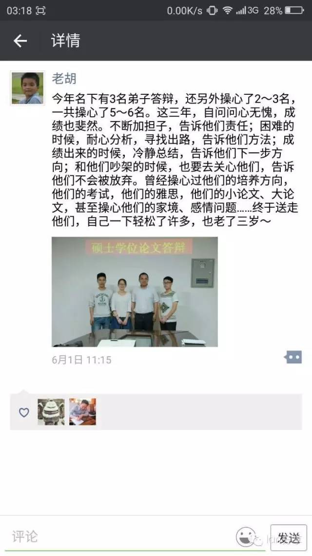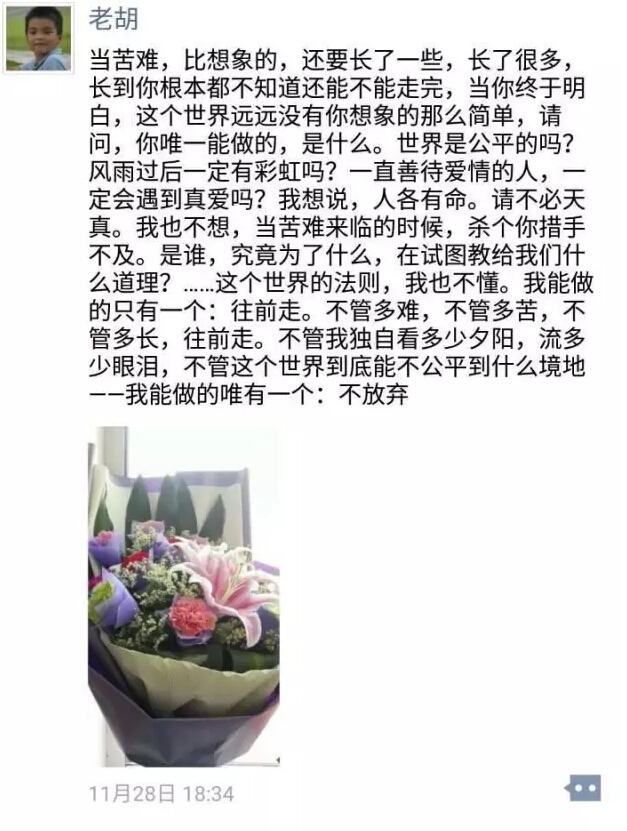 胡哥,记得你总是对工作与生活充满了热情。我知道,在你教授、博导、企业家等等这些光环的背后,是你超出常人的努力。记得多年前的某一天,你在深夜加班后在朋友圈里留下过这样的文字:“多年后的我一定会感谢今天这个努力的自己。”而多年之后的今天你为何已经远去。
