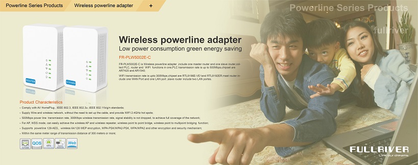 FR-PLW5002E-C是我司自主研发的500Mbps无线电力线适配器,集电力猫、路由器、WiFi等功能于一体,符合HomePlug AV、IEEE 802.3、IEEE 802.3u、IEEE 802.11b/g/n标准。该适配器通过电力线传输数据,提供500Mbps传输速率,同一电表范围内,可传输300米距离,满足中远距离数据传输需求,对未布置有线网络、有线网络走线困难等环境,可提供无需另外布线的解决方案,利用现有的电力线进行数据传输。同时,每个适配器又是WiFi热点,提供300Mbps无线传输速率,为手机、平板电脑等无线设备接入互联网提供入口,实现了点到面的全覆盖组网,适合大面积住房、公寓、别墅等场所。