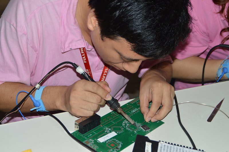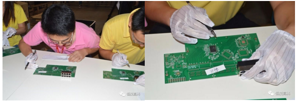 烙铁手比拼:小小的电子元器件,虽不起眼,但其作用不可小视,手艺高超的烙铁手把它们“串联”在PCB板上,整整齐齐,浑然一体,丝毫看不到任何焊接口,使一块块绿板变成了进入网络世界的“绿卡”。