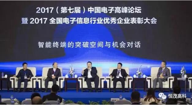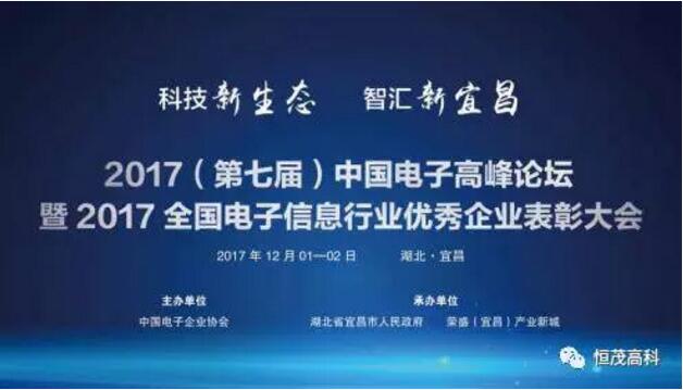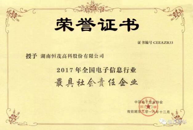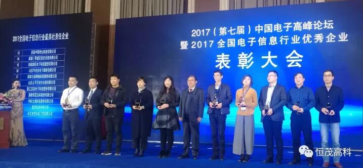 2017年12月1日、2日,2017(第七届)中国电子高峰论坛暨2017全国电子信息行业优秀企业表彰大会在湖北宜昌盛大举行,大会覆盖电子信息全产业链企业,是国内电子信息行业各领域领军企业的集体展示与高层交往盛会。恒茂高科应邀出席,并从主办方中国电子企业协会的手中接过“全国电子信息行业最具社会责任企业”的证书和奖杯,成为湖南地区唯一获此殊荣的企业。