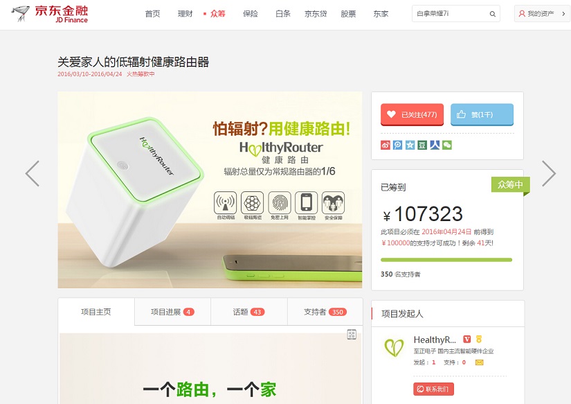 在市场化方面,记者了解到,这一项目采用技术研发与市场运营相结合的方式,以实现陶瓷科技的产业化和市场化。湖南省至正电子科技有限公司制造的名为Healthyrouter健康路由这一全球首款实现WiFi信号自动调节和应用防辐射吸波陶瓷材料的智能健康路由器,目前已登陆京东众筹,3月10月正式开启众筹。