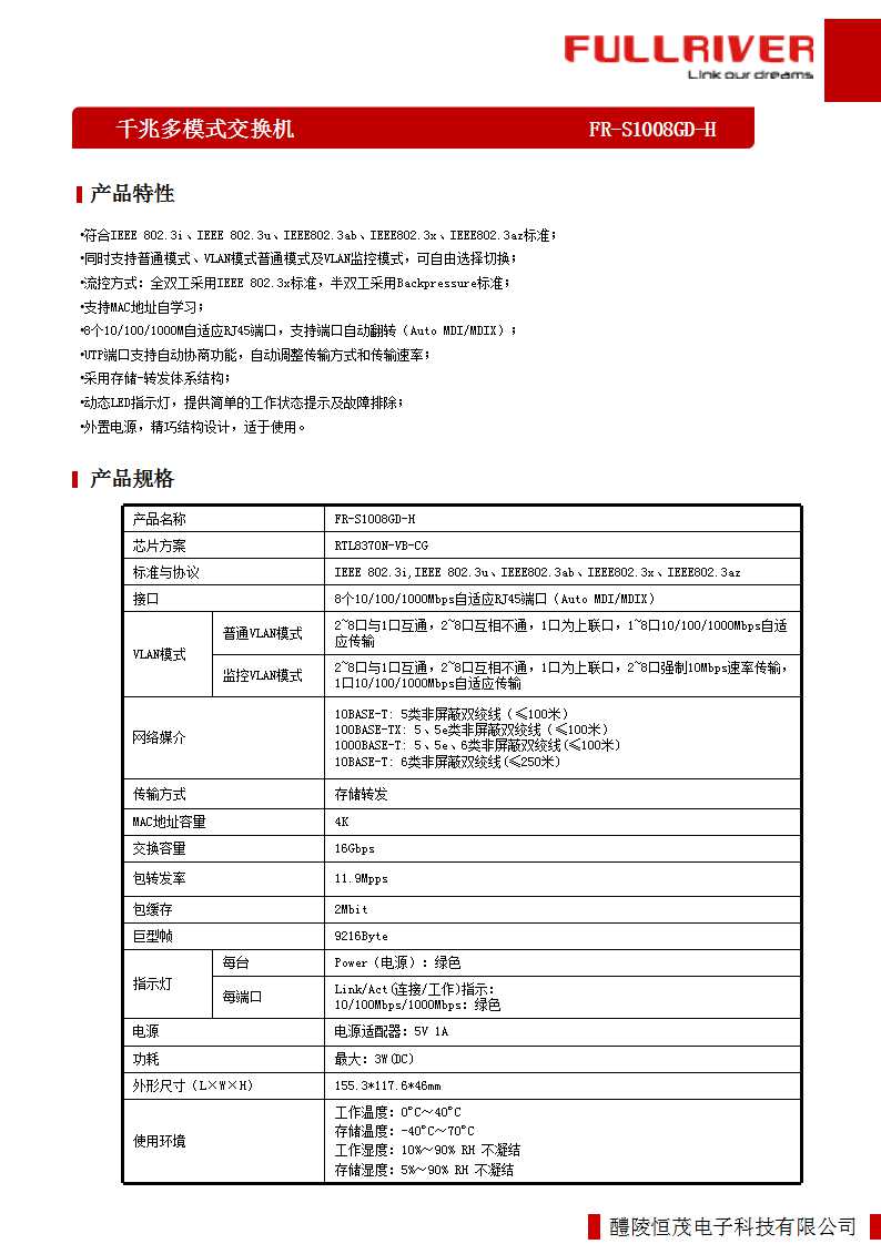 • 8个10/100/1000M自适应RJ45端口,支持端口自动翻转(Auto MDI/MDIX);