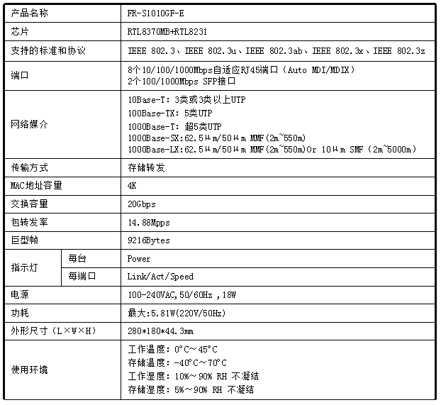 •     8个10/100/1000M自适应RJ45端口,支持自动翻转功能(Auto MDI/MDIX);