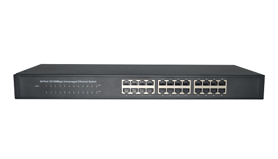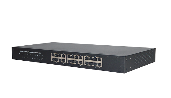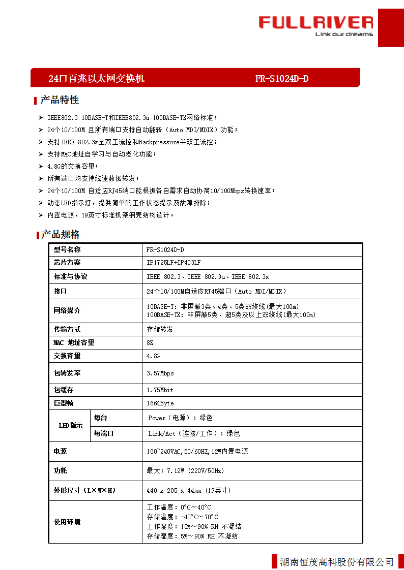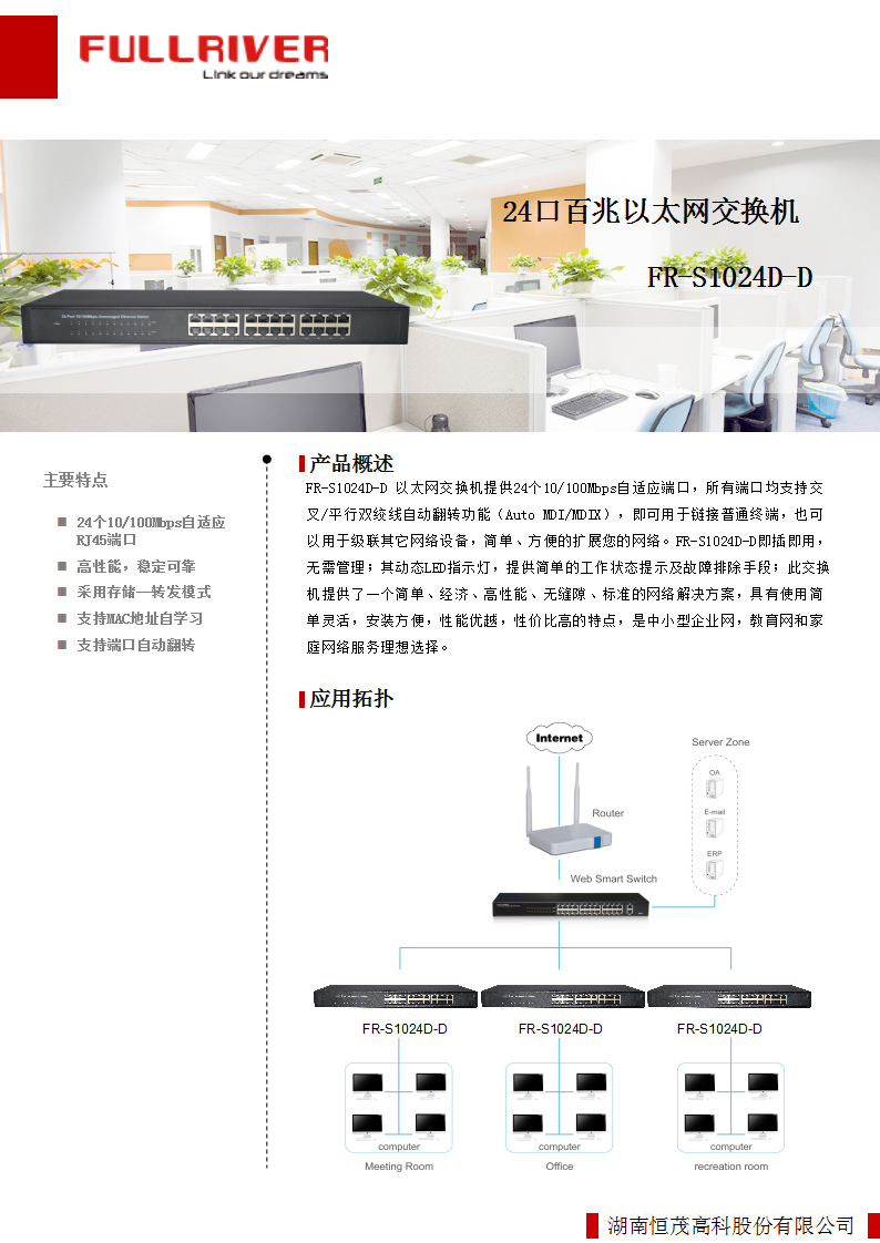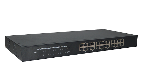 - 24个10/100M 自适应RJ45端口能根据各自需求自动协商10/100Mbps转换速率;