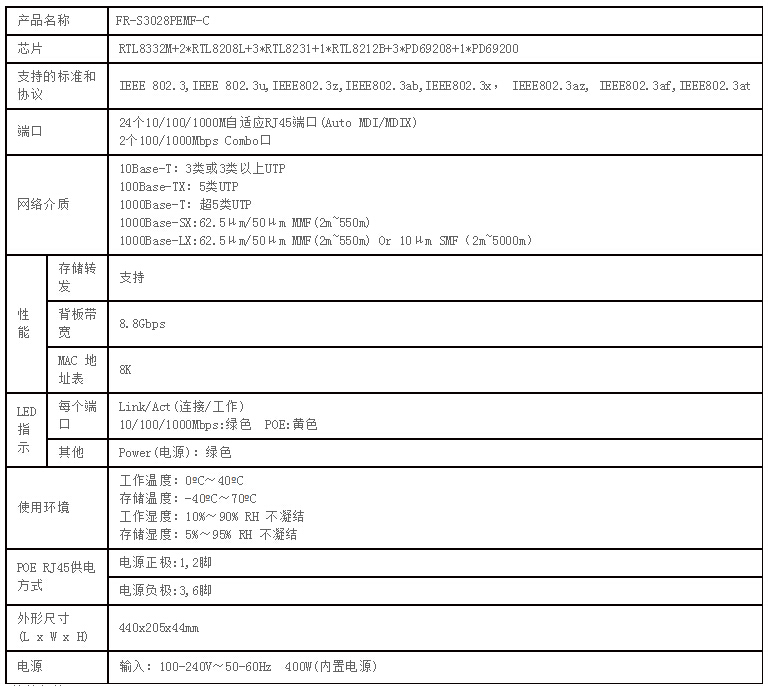 - 符合IEEE 802.3 、IEEE 802.3u、IEEE802.3ab、IEEE802.3x、IEEE802.3at、IEEE802.3af,IEEE802.3az等标准;