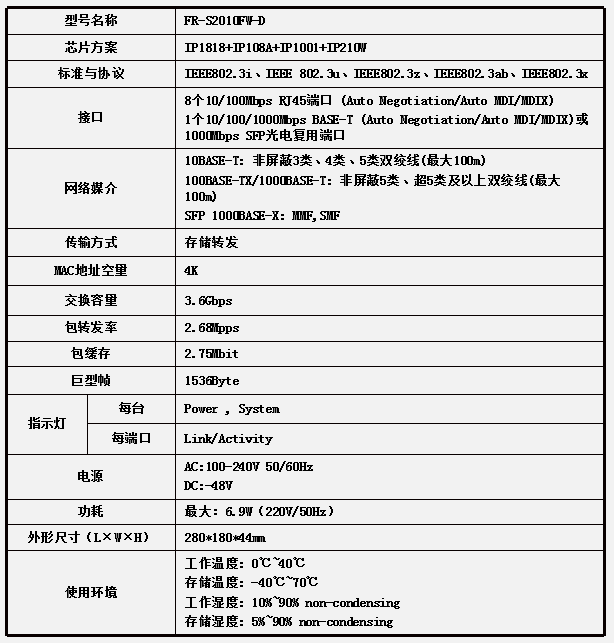 • 内置4K MAC地址表,支持MAC地址自学习;