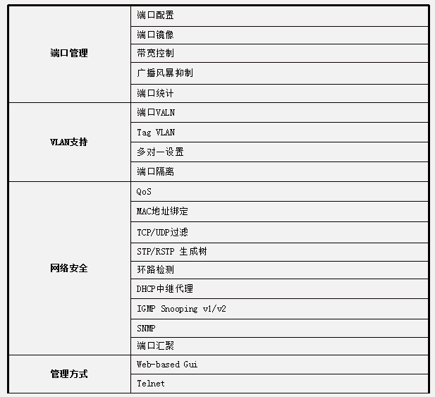 • 支持IGMP Snooping协议,有效缓解上层设备的转发压力;