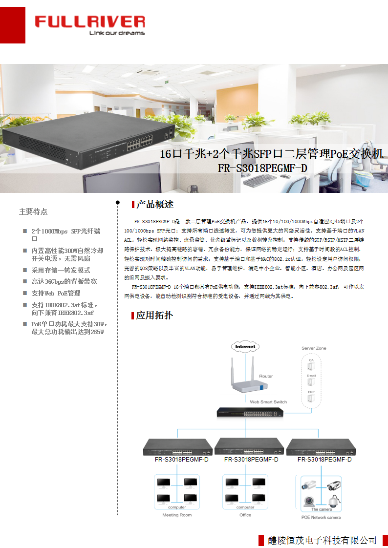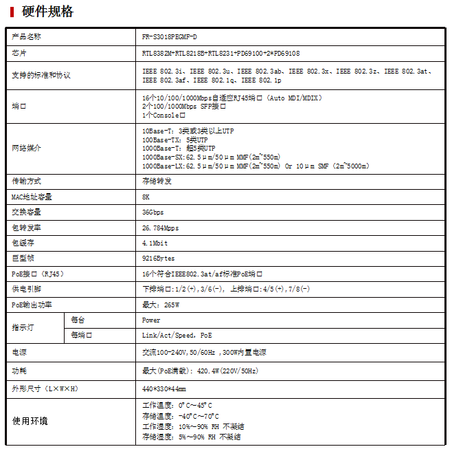 • 单个端口功耗最大支持30W,PoE总功耗最大可以达到265W;