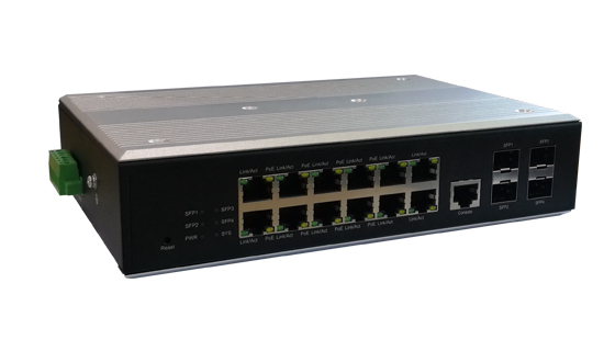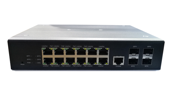 12个10/100/1000Mbps RJ45端口 (Auto Negotiation/Auto MDI/MDIX),其中8个支持PoE供电 4个1000Mbps SFP光口 1个Console端口 1个Reset按键 1个可插拔的6针接线端子