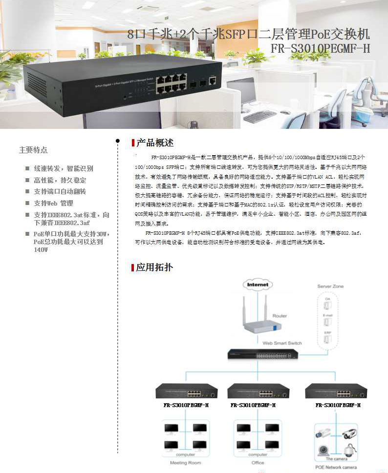 符合IEEE 802.3i、IEEE 802.3u、IEEE 802.3ab、IEEE 802.3x、IEEE 802.3z、IEEE802.1Q 、IEEE802.1p、IEEE802.3af、IEEE802.3at标准;