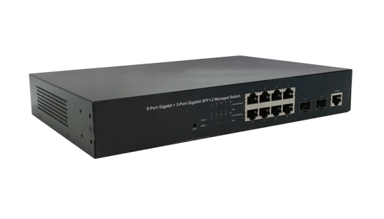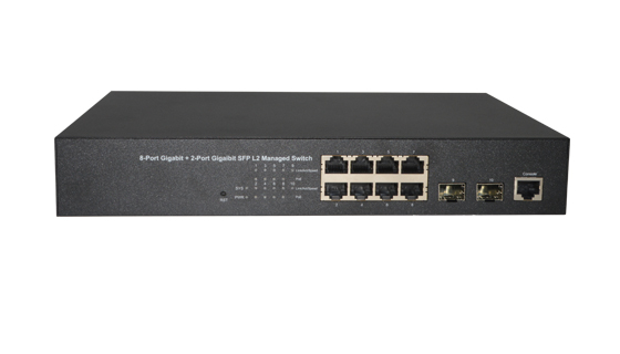 8个10/100/1000Mbps自适应RJ45端口(Auto MDI/MDIX); 2个100/1000Mbps SFP接口 1个Console端口