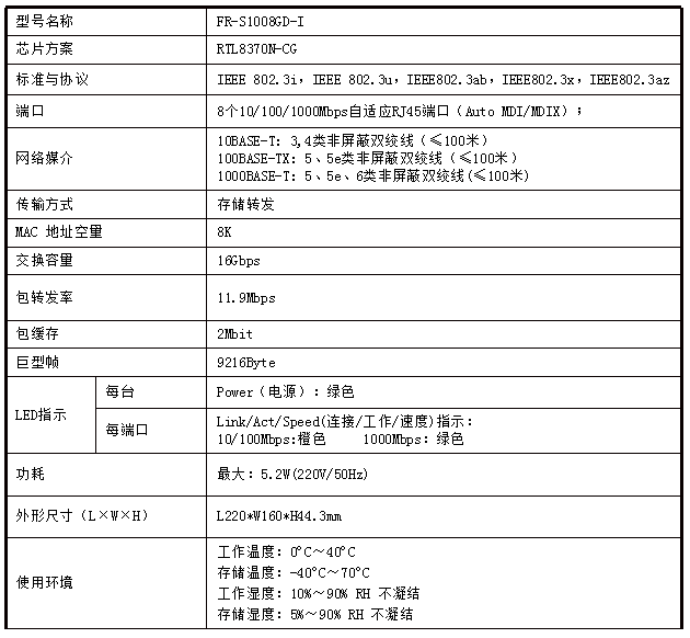 • 8个10/100/1000M自适应RJ45端口,支持端口自动翻转(Auto MDI/MDIX);