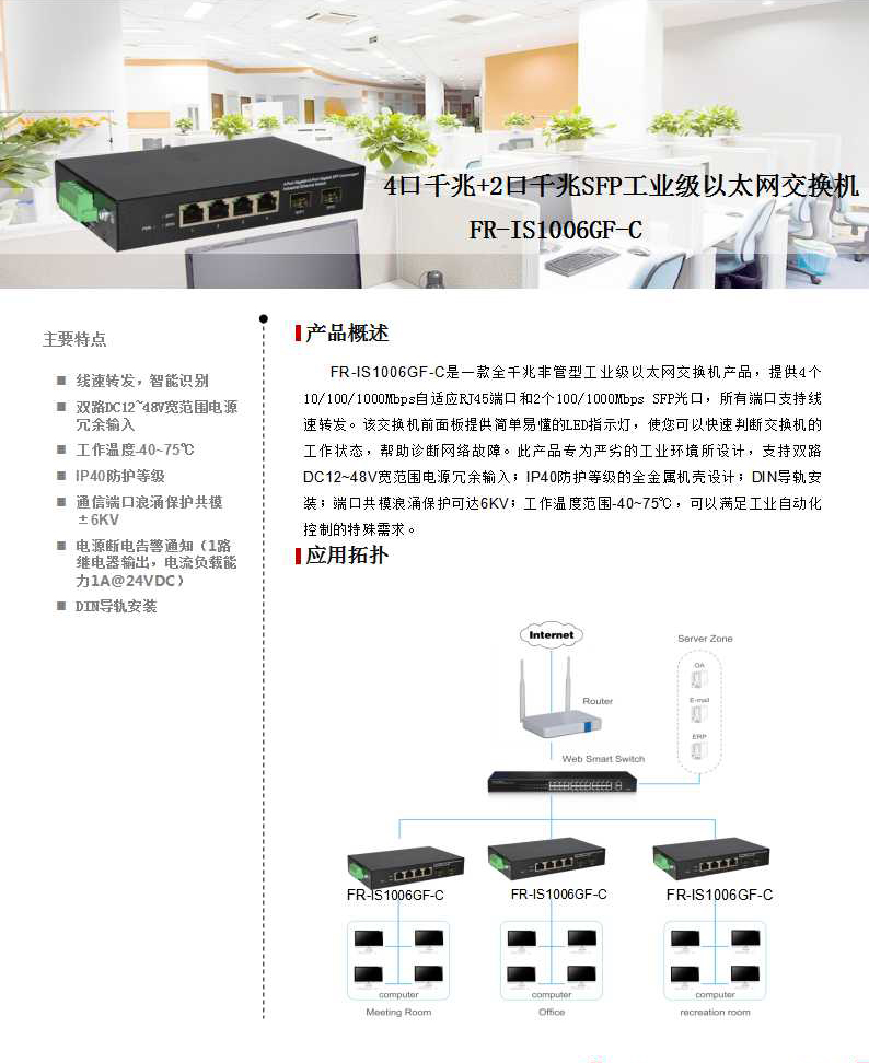 4个10/100/1000Mbps自适应RJ45端口(Auto MDI/MDIX) 2个100/1000Mbps SFP接口