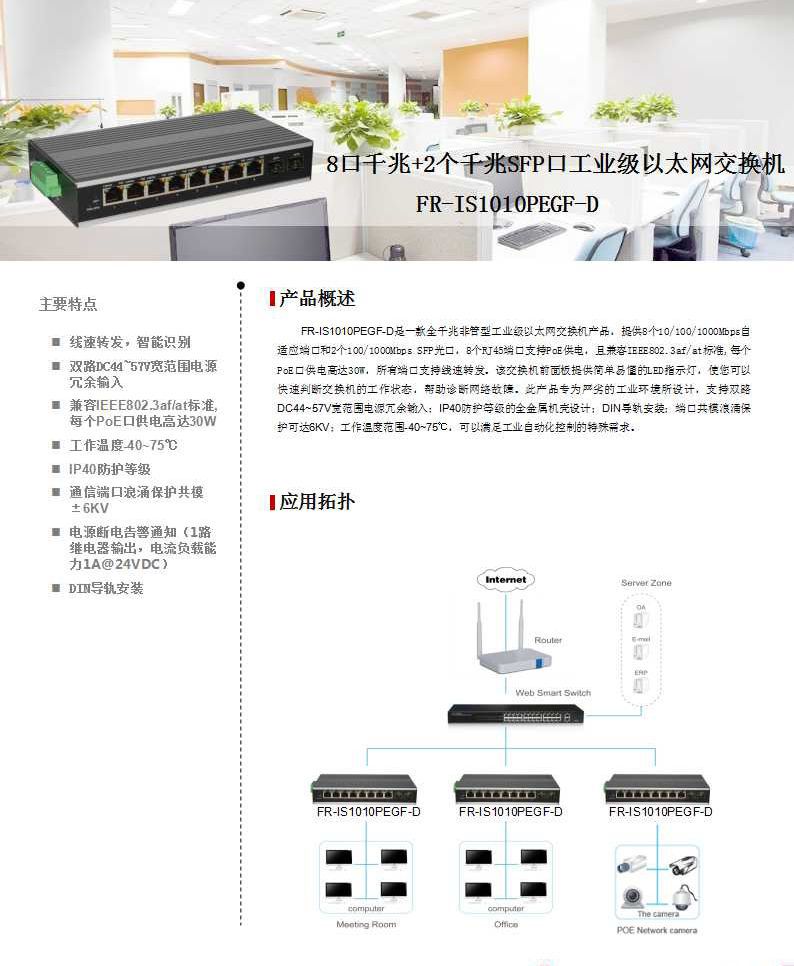 8个10/100/1000Mbps自适应RJ45端口(Auto MDI/MDIX) 2个100/1000Mbps SFP接口