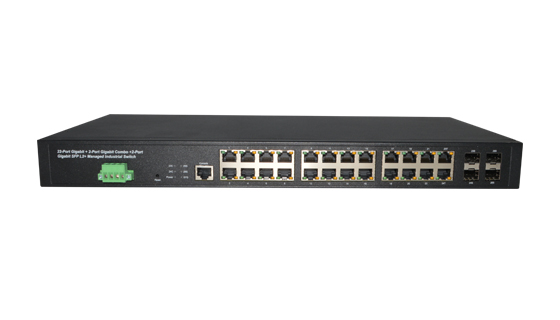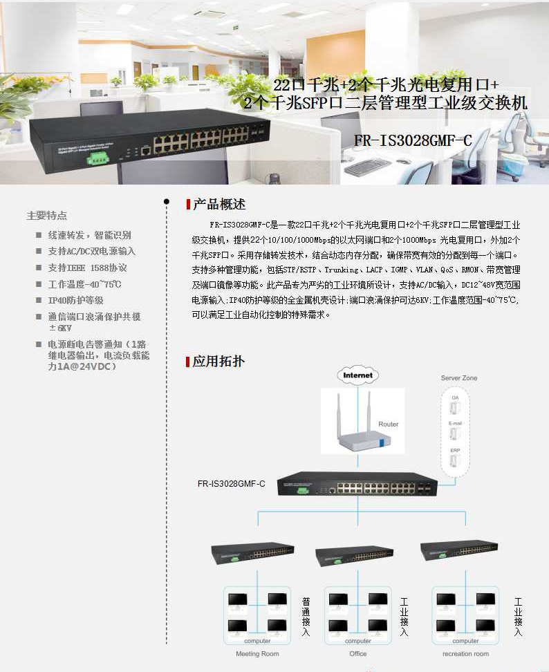 22个10/100/1000Mbps RJ45端口 (Auto Negotiation/Auto MDI/MDIX) 2个1000Mbps SFP光口 2个1000Mbps 光电复用端口 1个Console端口 1个Reset按键 1个可插拔的4针接线端子